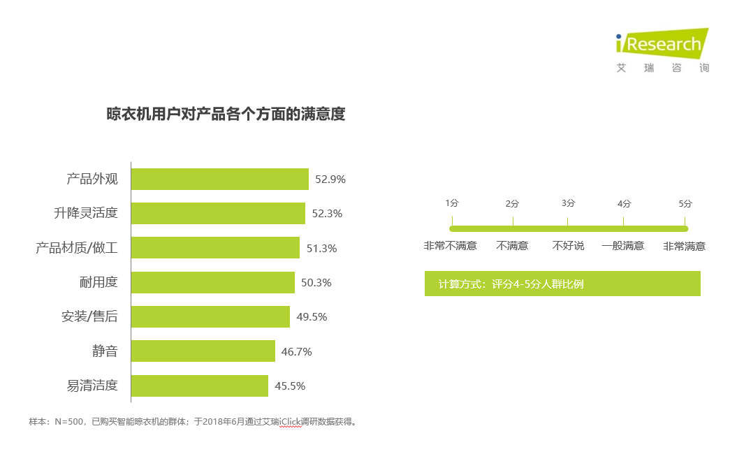 智能晾衣機的產品外觀成為黑馬,是用戶最為滿意的方面;其次,自動升降作為智能晾衣機的核心功能,升降的靈活度受到用戶好評。產品材質/做工、耐用度方面的滿意度均超出50%。