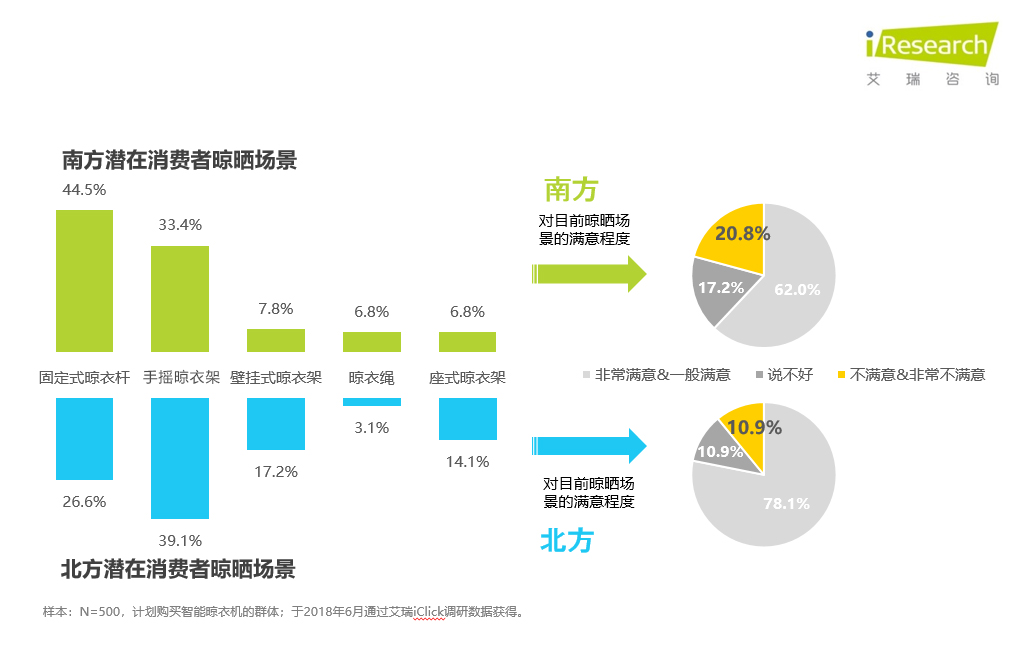 通過對計劃購買智能晾衣機的潛在消費者進行調研,南方消費者目前主要采用的晾曬工具是固定式晾衣桿,其次為手搖晾衣機,20.8%的消費者對目前晾曬場景不滿意或非常不滿意,17.2%持中立態度。北方消費者主要采用的晾曬工具是手搖晾衣機,10.9%的消費者表示不滿意目前的晾曬場景。