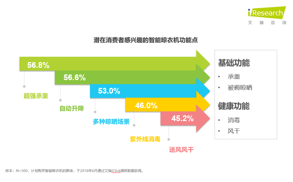 對于暫未購買的消費者來說,對智能晾衣機超強承重、自動升降和多種晾曬場景等傳統基礎上的升級點非常關注,同時超出40%的群體對創新型的健康保護功能,如紫外線消毒和送風風干等表示關注。