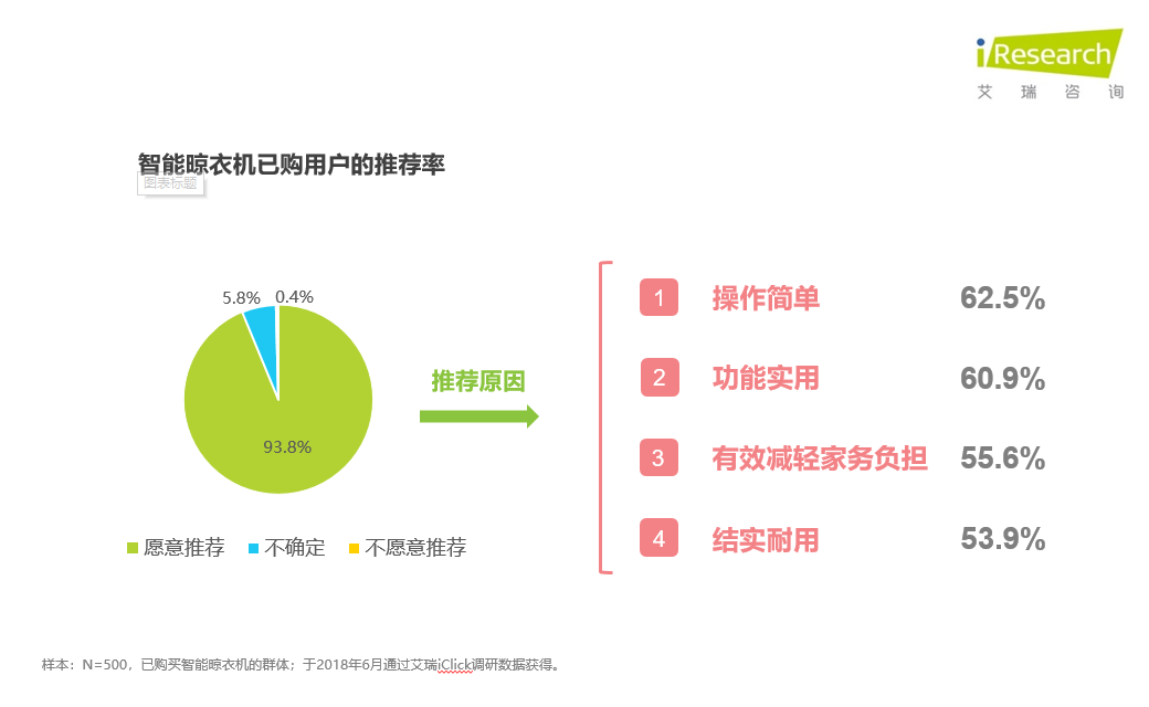 已經購買智能晾衣機的用戶中,93.8%的用戶愿意將該產品推薦給親友,推薦原因中,操作簡單排在首位,其次為功能實用和有效減輕家務負擔。智能晾衣機的實用性經得起市場的考驗。