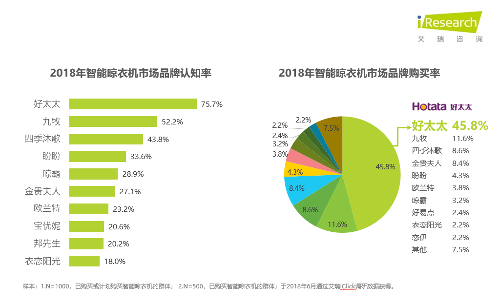 購買過智能晾衣機的用戶中,好太太的品牌知曉率高達75.7%,購買率45.8%,智能晾衣機市場品牌化表現突出。