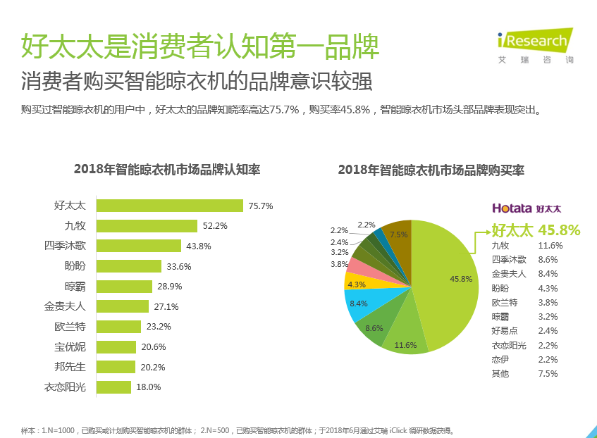 好太太自創(chuàng)立19年以來,深受全球家庭的喜愛。2018年由權(quán)威機(jī)構(gòu)——艾瑞,發(fā)布《陽臺革命白皮書》,調(diào)研數(shù)據(jù)顯示,好太太品牌認(rèn)知率高達(dá)75.7%,購買率高達(dá)45.8%,再度彰顯好太太冠軍姿態(tài)。