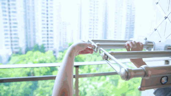 過去江家的陽臺(tái),只有兩條鐵桿當(dāng)晾桿,晾曬的空間非常有限,還需要人力一件一件反復(fù)去掛衣服,有時(shí)候洗了床單被子,晾桿就不夠用,只能在陽臺(tái)找其他位置晾,陽臺(tái)變成了雜亂的曬衣房,一點(diǎn)也不美觀。