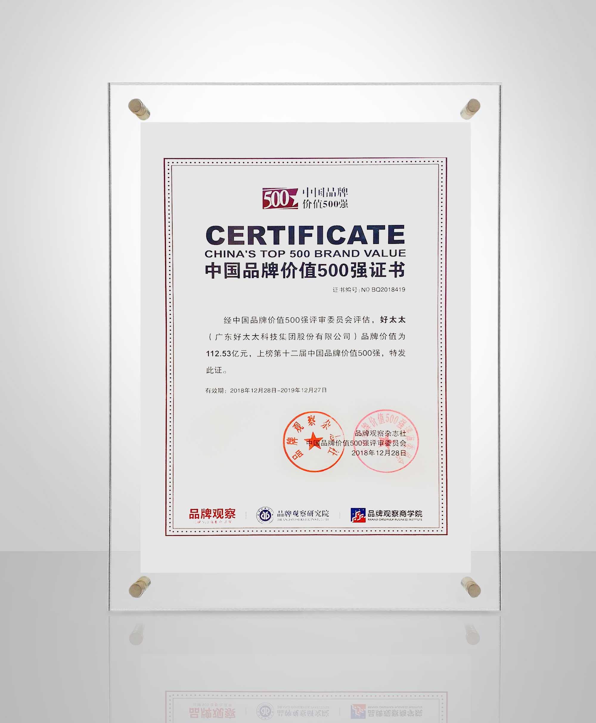 大會(huì)上正式揭曉第12屆中國(guó)品牌價(jià)值500強(qiáng)榜單。好太太以112.53億元的品牌價(jià)值榮登行業(yè)榜首!