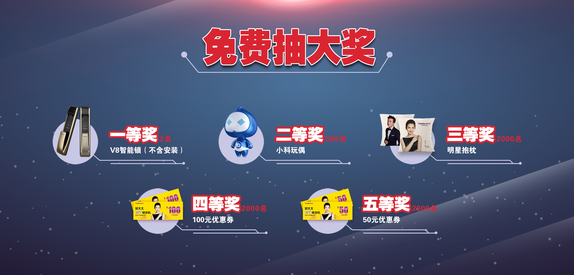 每日可免費(fèi)抽獎一次,價值2998元的科徠尼高鐵專列版V8、明星抱枕、小科玩偶、100元/50元優(yōu)惠券天天送。