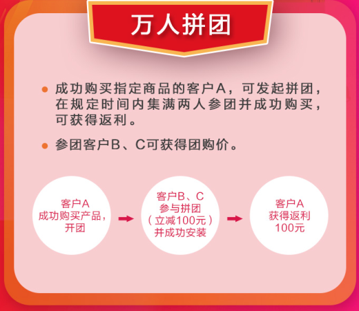 1、用戶A在線購(gòu)買成功后,可發(fā)起拼團(tuán),規(guī)定時(shí)間內(nèi)集滿兩人參團(tuán)并成功購(gòu)買,可獲得返利。