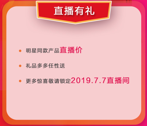 通過(guò)線上直播系統(tǒng),客戶可自由選擇在線上微商城或線下門店下單,均可享受直播價(jià),禮品多多狂歡送。更多驚喜敬請(qǐng)鎖定2019年7月7日直播間
