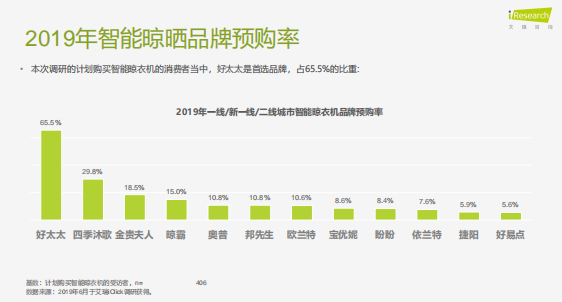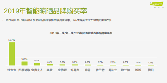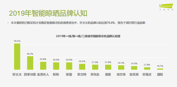 白皮書數據公開可知,好太太的品牌認知度更是達到78.6%,且調研的已購買和正在使用智能晾衣機的消費者當中,近6成購買過好太太的智能晾衣機消費者。不論是品牌認知度、購買率和預購率等都是以大比例拉開第二名。尤其在產品購買率上,好太太領先第二名46.4%,數據背后體現的是,所有品牌晾曬市場都不及好太太一家的體量大,好太太在業內不僅是“大牌子”,而是“超級大牌”。