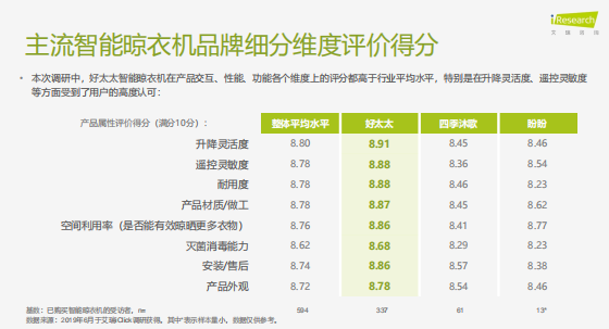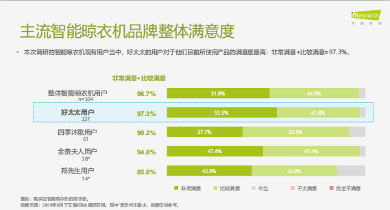 購買智能晾衣機消費者,對好太太智能晾衣機所使用產品的滿意度最高達到97.3%,且從晾衣機升降靈活度、遙控靈敏度、耐用度、滅菌消毒能力等多個維度上看,都是高于整體平均水平。