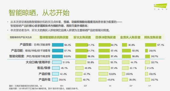 從本次受訪者選購智能晾衣機的關注點來看,性能、功能和智能化程度是消費者最為看重的,智能晾曬產品的核心訴求是其技術內核的升級,而非只是外觀優化。