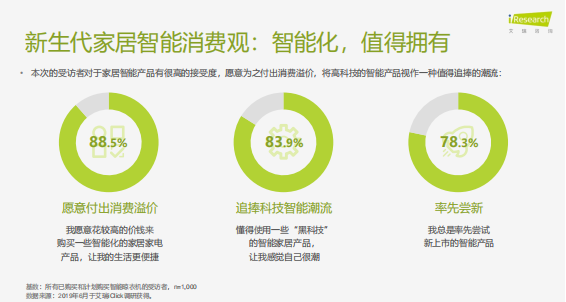 新生代家居智能消費觀會更偏向智能化,本次的受訪者對于家居智能產品有很高的接受度,愿意為之付出消費溢價,將高科技的智能產品視作一種值得追捧的潮流。