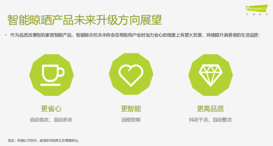 作為品質改善型的家居智能產品,智能晾衣機未來將會在幫助用戶省時省力省心等三個維度上有更大發展,持續提升消費者的生活品質。