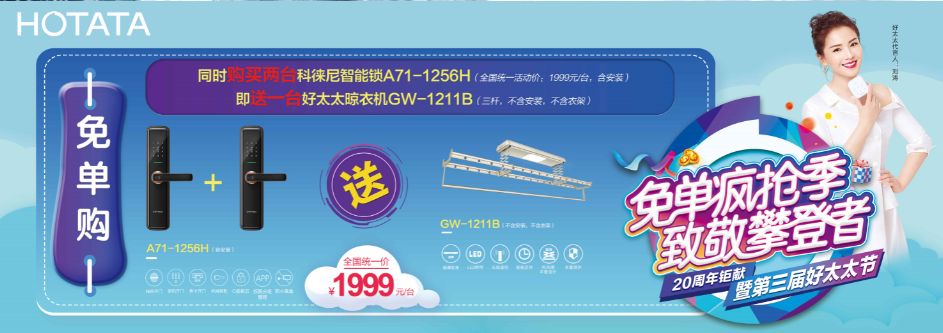 *免單購:同時購買兩臺科徠尼智能鎖A71-1256H(全國統(tǒng)一活動價:1999元/臺,含安裝),即送一臺好太太晾衣機GW-1211B(三桿,不含安裝,不含衣架)