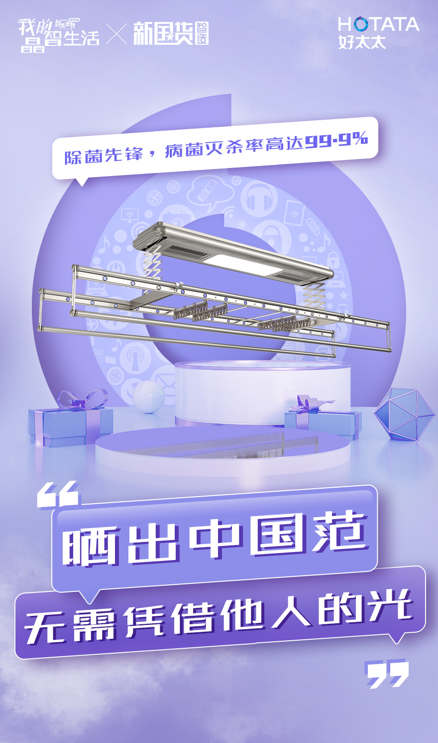 好太太1266智能晾衣機(jī),施華洛世奇®元素點(diǎn)綴其中,打造晾衣機(jī)的“門面擔(dān)當(dāng)”,顏值抗打之余,內(nèi)涵十足,自帶大燈,消毒、風(fēng)干、APP控制皆不在話下,營(yíng)造晶智家。