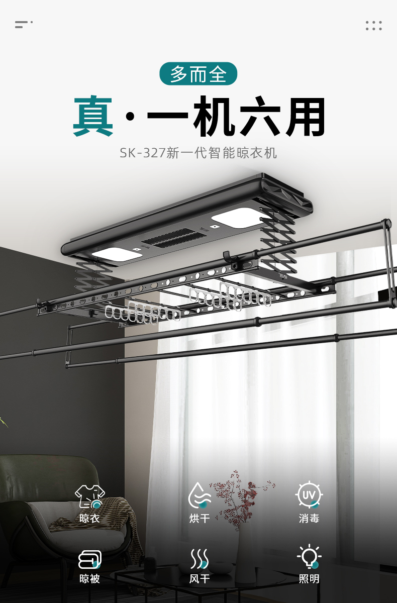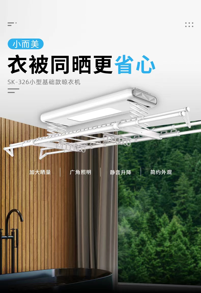 曬客SK-326智能晾衣機:小機身大曬量,外觀簡約,且具備廣角照明,靜音升降等功能;曬客SK-327智能晾衣機:集晾衣、烘干、消毒、晾被、風干、照明等功能。