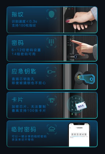 指紋、密碼、應急鑰匙、卡片、臨時密碼