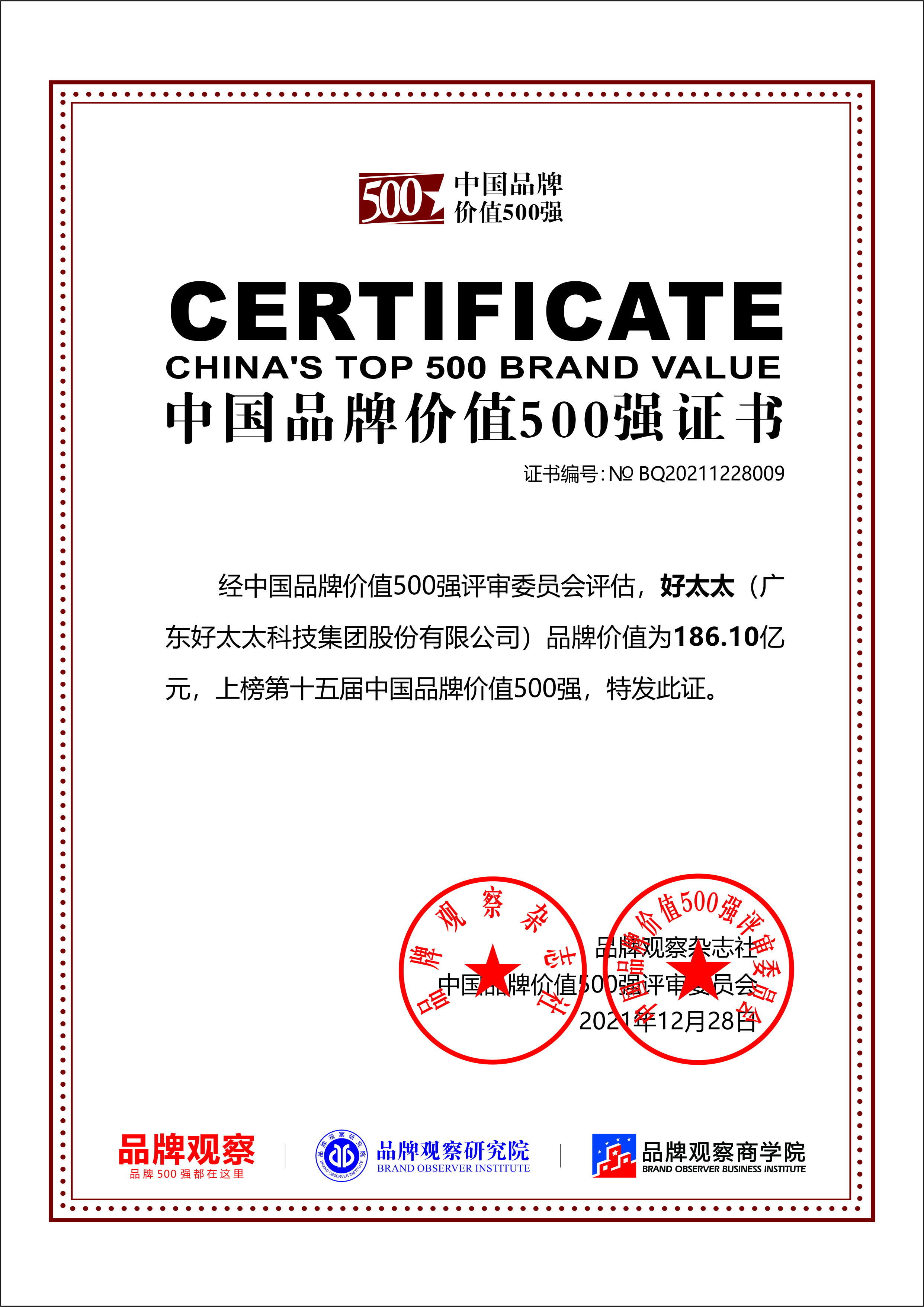 憑借強大綜合實力及品牌影響力,好太太以216.83億元的品牌價值再次榮登“中國品牌價值500強”。